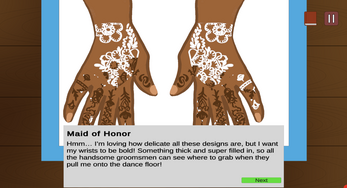 Mehndi Night is a point-and-click drawing game created as part of a larger interactive museum exhibit designed to teach children ages 7-12 about the process, application, and cultural relevance of temporary Henna tattooing in Eastern cultures. Play as a Henna artist helping wedding guests choose and apply Henna designs that fit their individual requirements. Read their design requests carefully and choose the best options from a variety of Henna designs- then trace a stencil to apply. The more guests like their Henna, the more stars you’ll earn at the end, so choose wisely- and have fun!